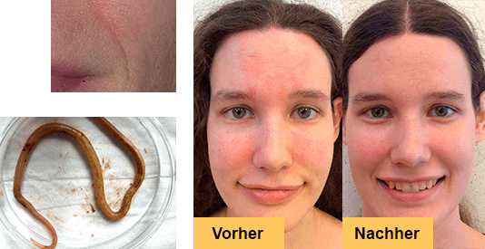 Viele Jahre lang litt ich an Dermatitis und Allergien, kein Mittel half mir. Ich konnte nicht einmal im Sommer offene Kleidung tragen, weil alle Schultern und Arme mit Allergien bedeckt waren. Ein Bekannter riet Detoxil Water und sagte, dass mein Problem durch Parasiten verursacht werden könnte. Nach ein paar Einnahmen von Detoxil Water kam ein Haufen von Parasiten aus mir heraus. Ich bin schockiert! Aber die Hauptsache ist, dass die Haut jetzt in perfekt Zustand ist.